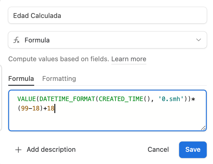 Como puedes, en Airtable no existe una función «random()» que nos permita obtener un número aleatorio. Por ello, haremos uso de la fecha de creación del registro y después realizaremos un tratado del dato para conseguir un valor que se encuentre dentro de un rango.